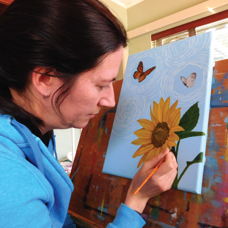 This is why I painted a sunny sunflower and butterflies on a blue sky. The circular pattern gives interest and reinforces the calming effect of nature.